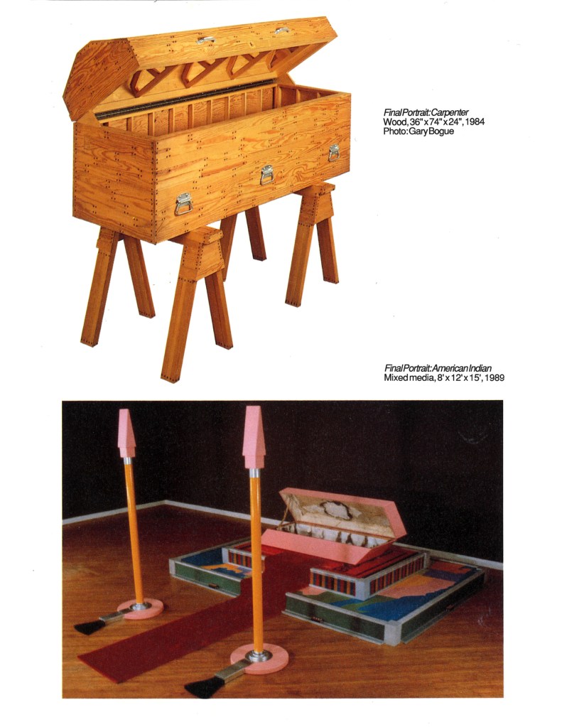 Having noted parallels in language relating to art and to death–“hanging” pictures, “executing” works, “shooting” photographs–Michael Aurbach began the “body” of work titled Final Portraits. Each piece is a variation of the container sarcophagus, the whole series an ironical parody of the Western funerary tradition.